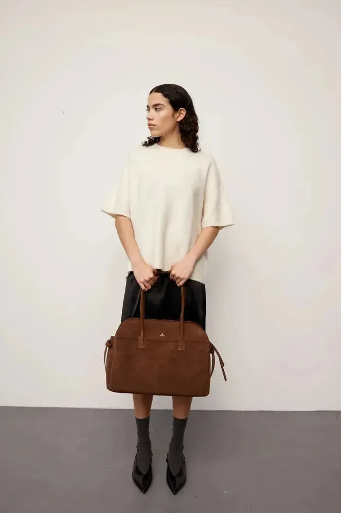 En stilfull og romslig skinnveske med mykt semsket ytterlag og strukturert innside, perfekt for jobb eller daglig bruk. Den har et feminint, buet design med et stort hovedrom som lukkes med glidelås. Det store hovedrommet rommer enkelt en bærbar PC og dokumenter, mens flere innvendige lommer holder eiendeler organisert. Lange håndtak sikrer god og komfortabel bæring over skulderen.
