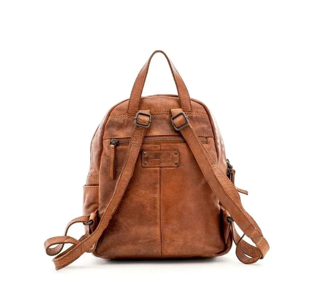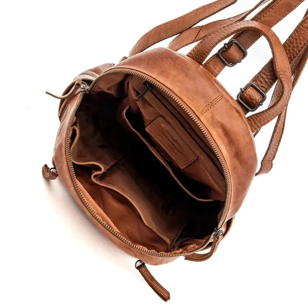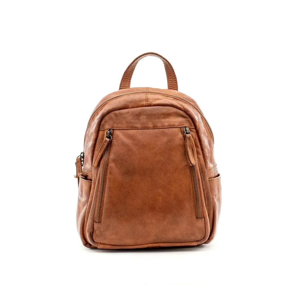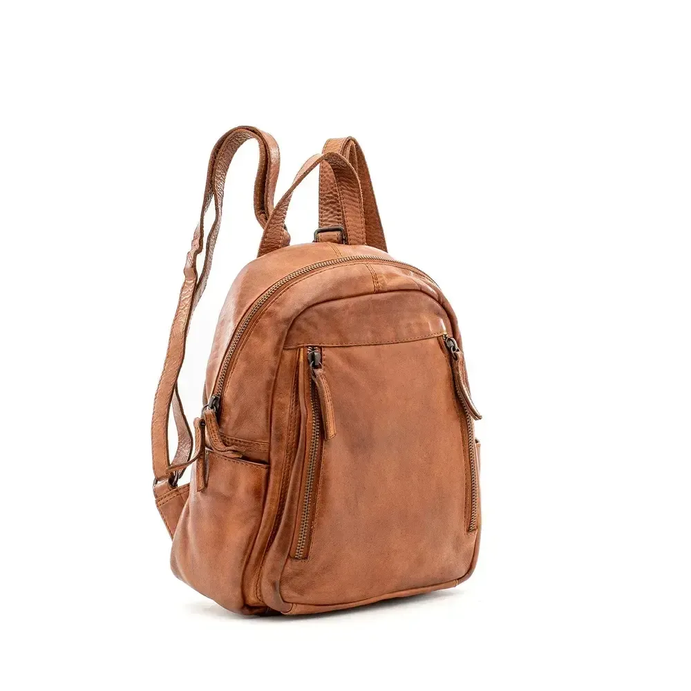 Liten ryggsekk i ekte vasket skinn med et vintage uttrykk. En tidløs, praktisk modell med mange lommer, perfekt for arbeid eller fritid. Lukkes med to-veis glidelås. Ett romslig hovedrom med flere innvendige åpne lommer samt en av dem med glidelås. På baksiden finnes en lomme med glidelås og i front en glidelåslomme med to glidelåser. En åpen lomme på hver side.  Justerbare skulderstropper og et håndtak på toppen.