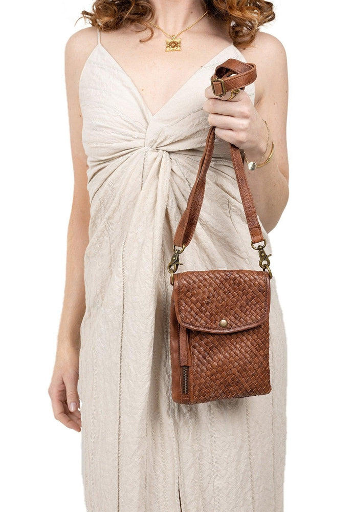 Denne slanke skuldervesken i skinn er vakkert flettet for hånd, noe som gjør denne vesken unik. Vesken åpnes/lukkes med en trykknapp som fører til ett åpent rom med praktisk innredning for organisering av eiendelene dine. To utvendige glidelåslommer: en foran og en på baksiden. Vesken er perfekt til hverdagsbruk og til fest med plass til det mest nødvendige.